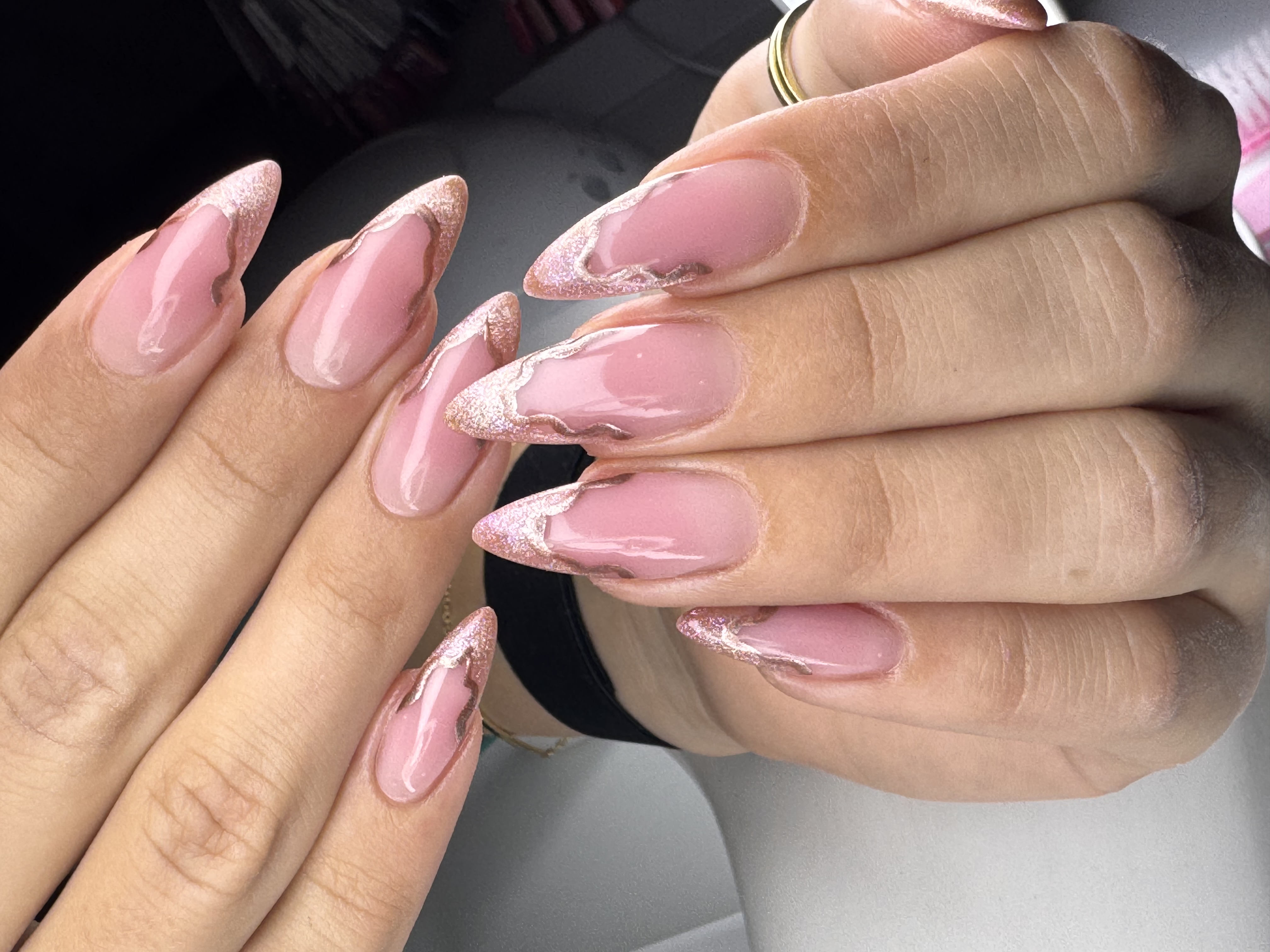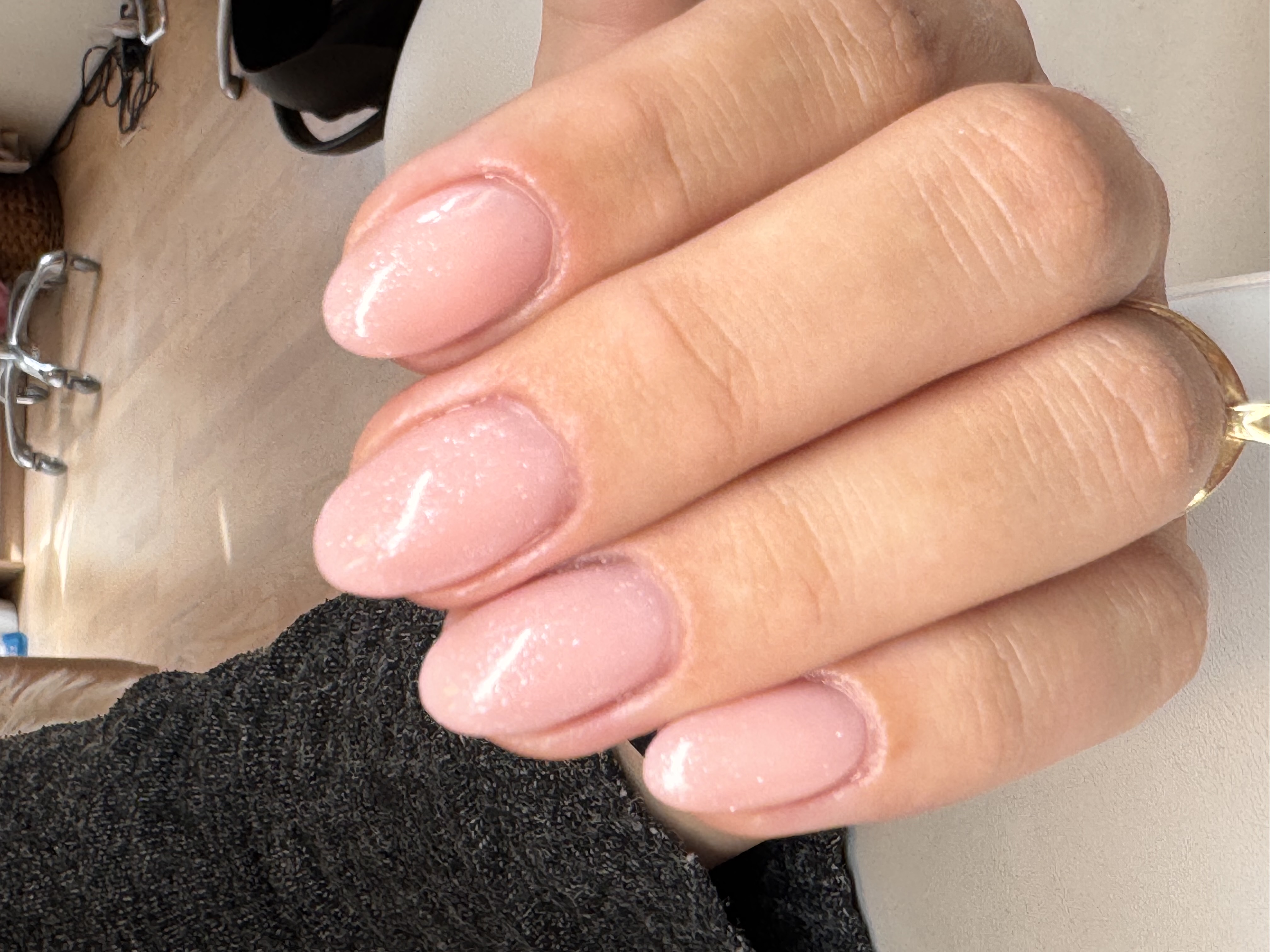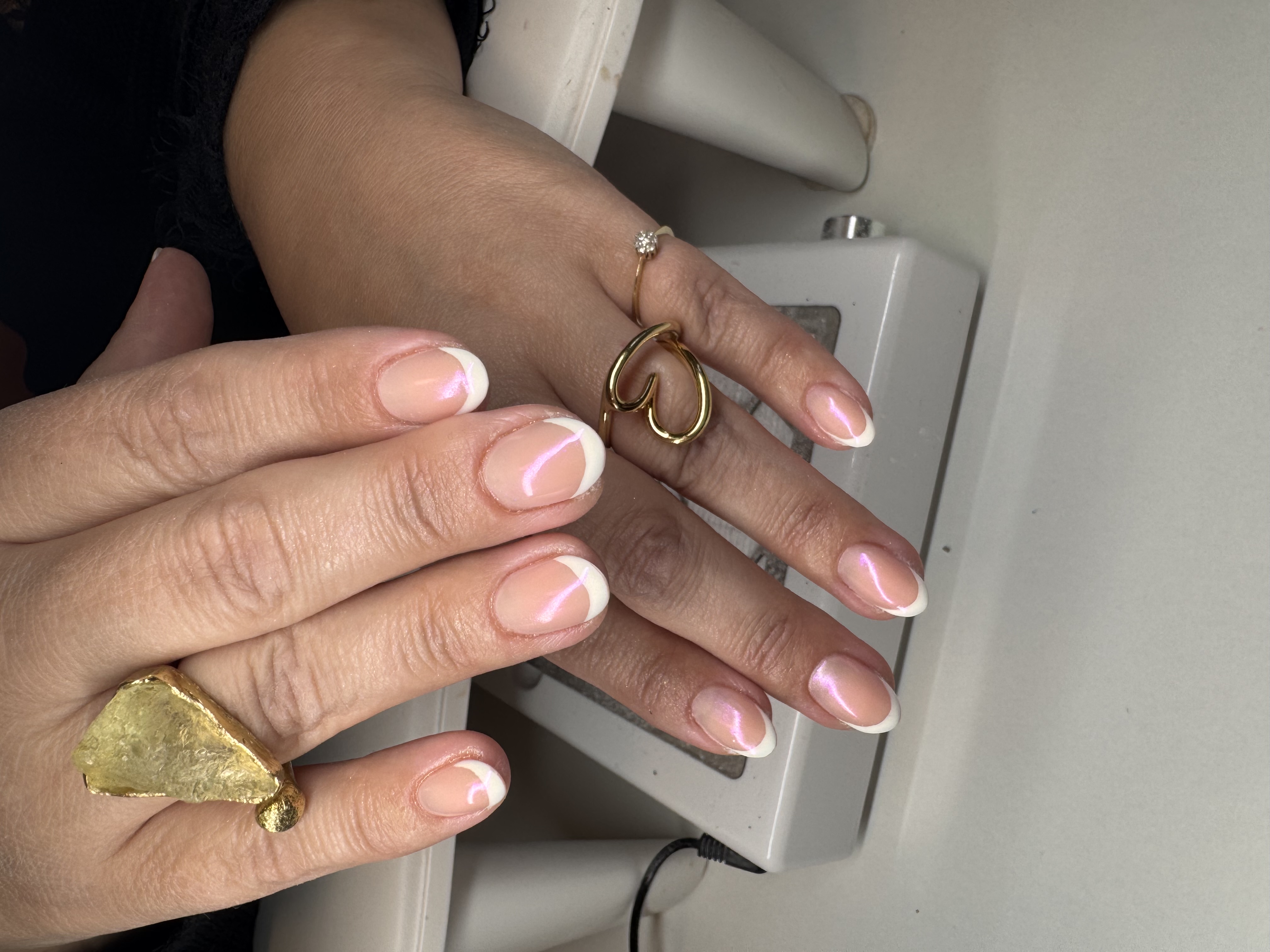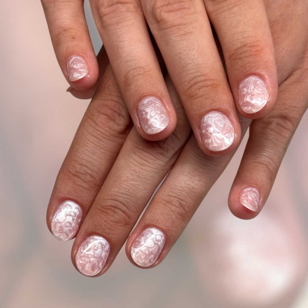 Kort Forstærkning af egne negle med fin perlemor gel.