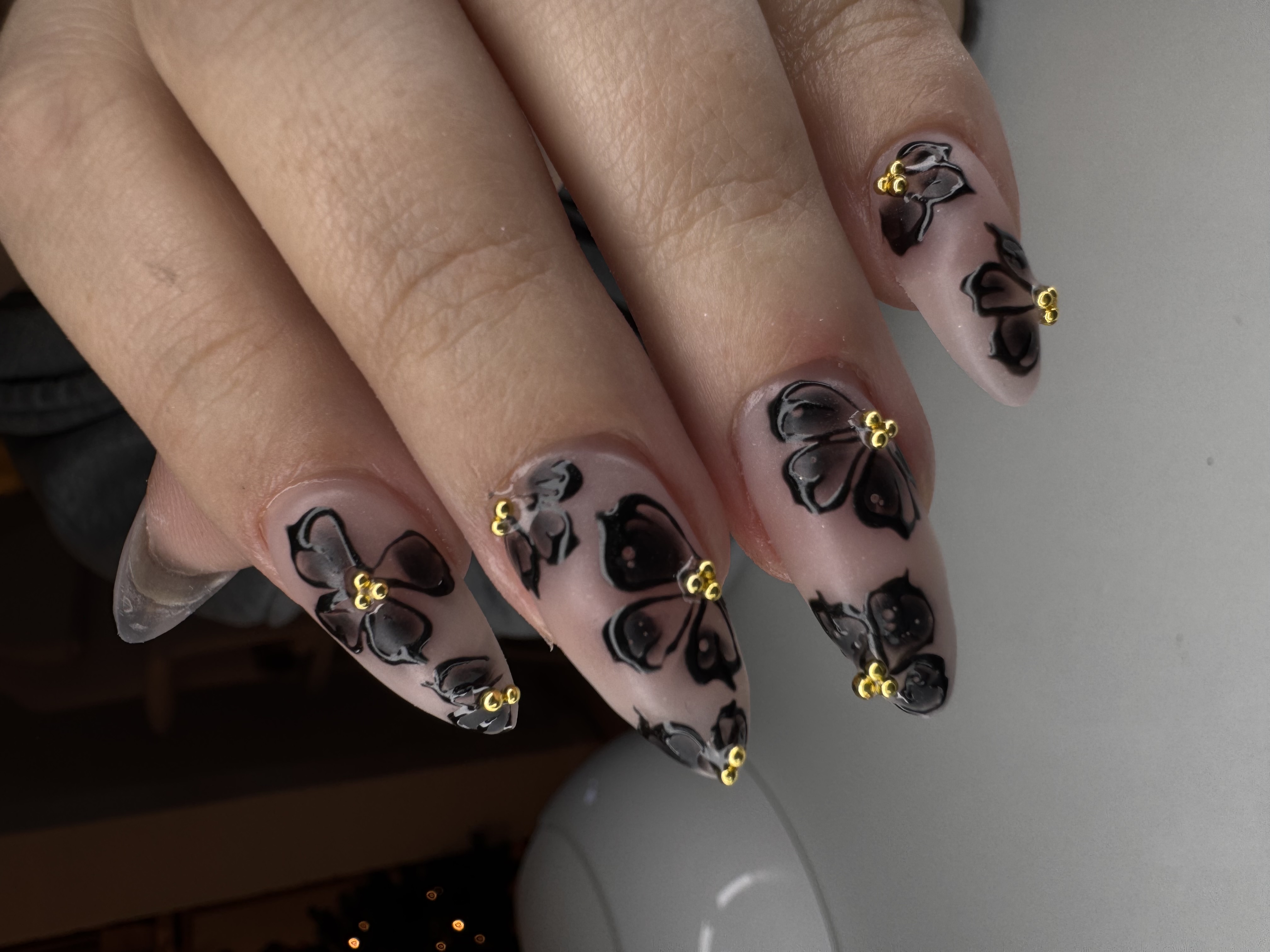 Mellem/lang Forlængelse med pynt på alle 10 negle inkl. charms og gulddetaljer.