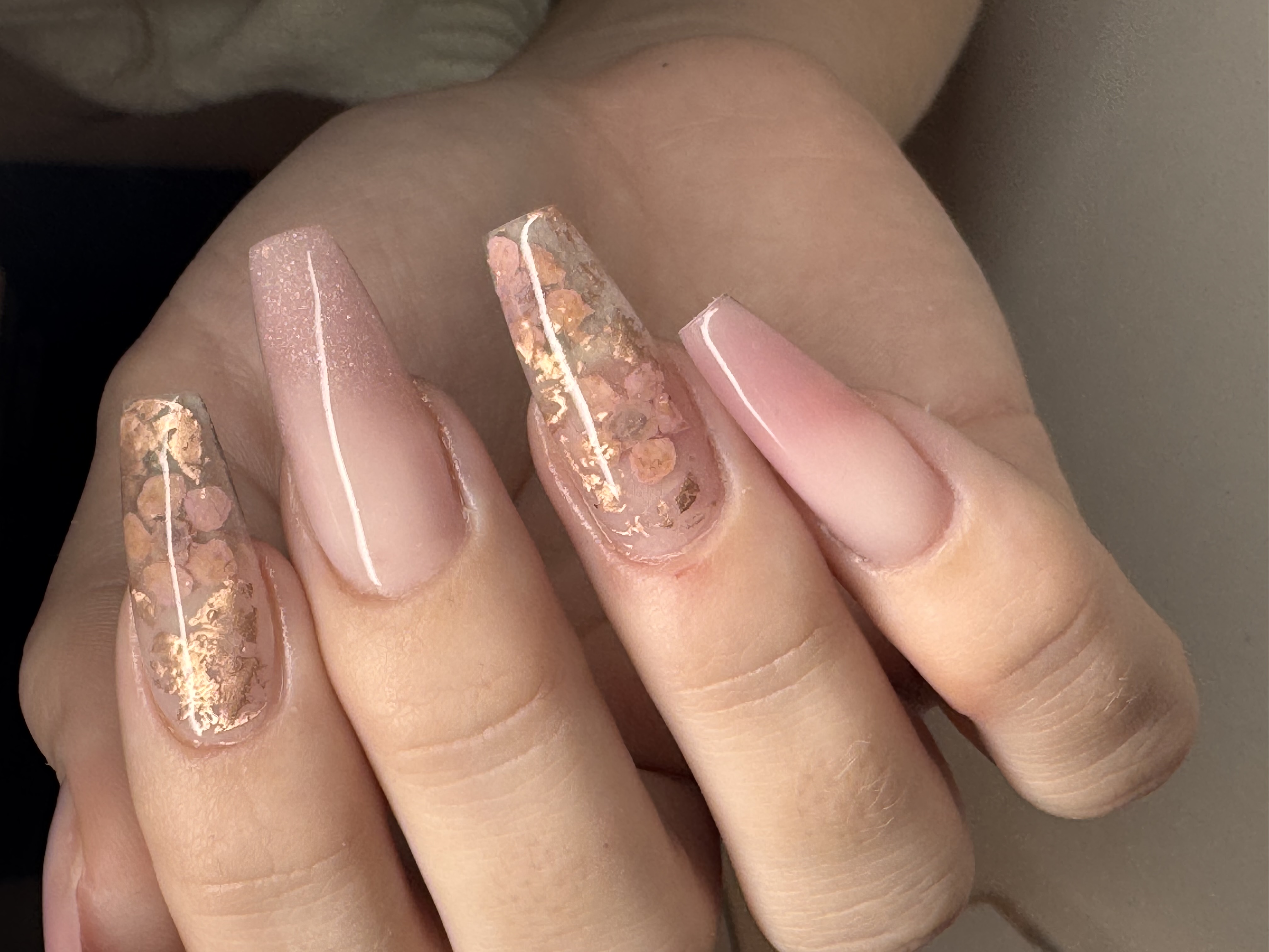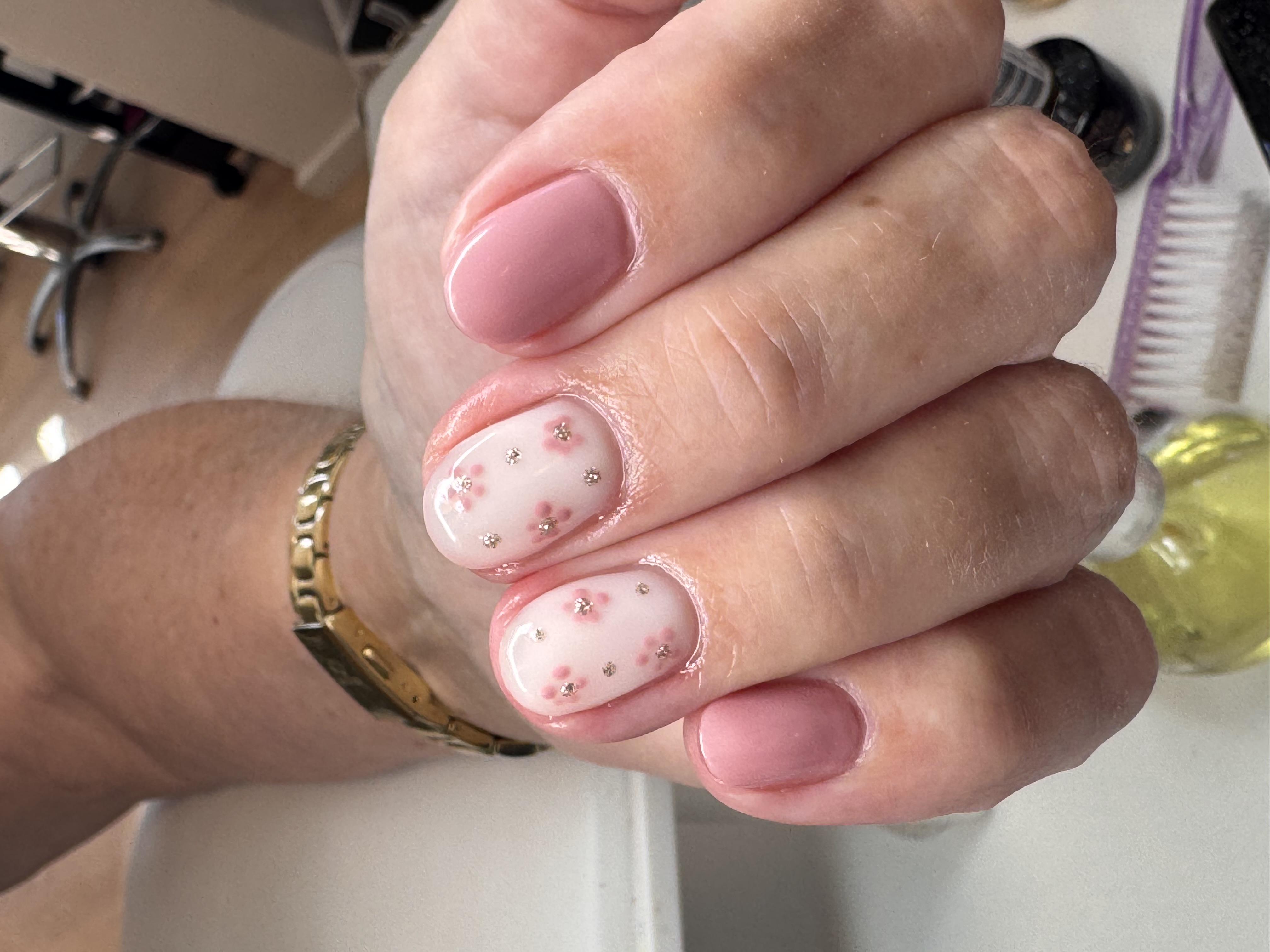 Kort Forstærkning af egne negle med pynt på to negle. Små simple lyserøde blomster.