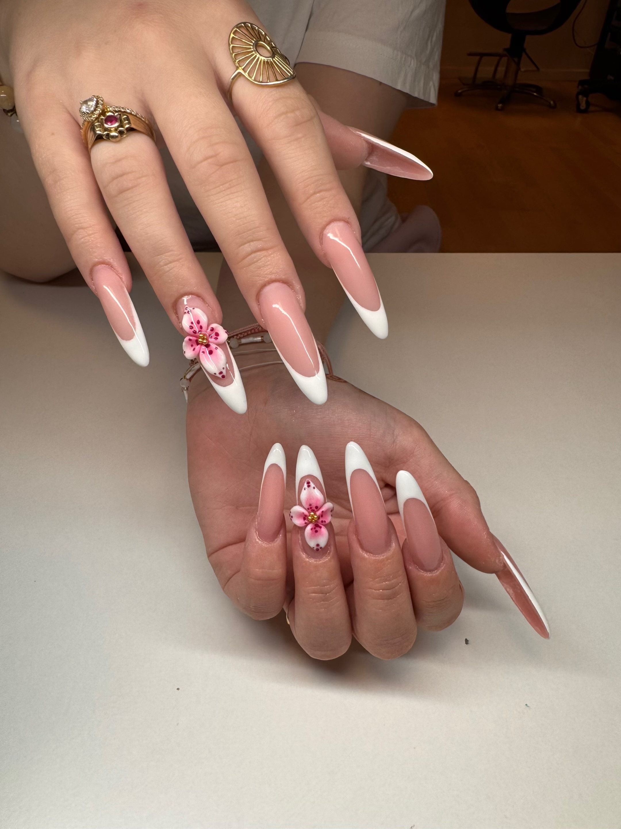 Lang Forlængelse med fransk kant og ekstra design på alle 10 negle med rosedesign.