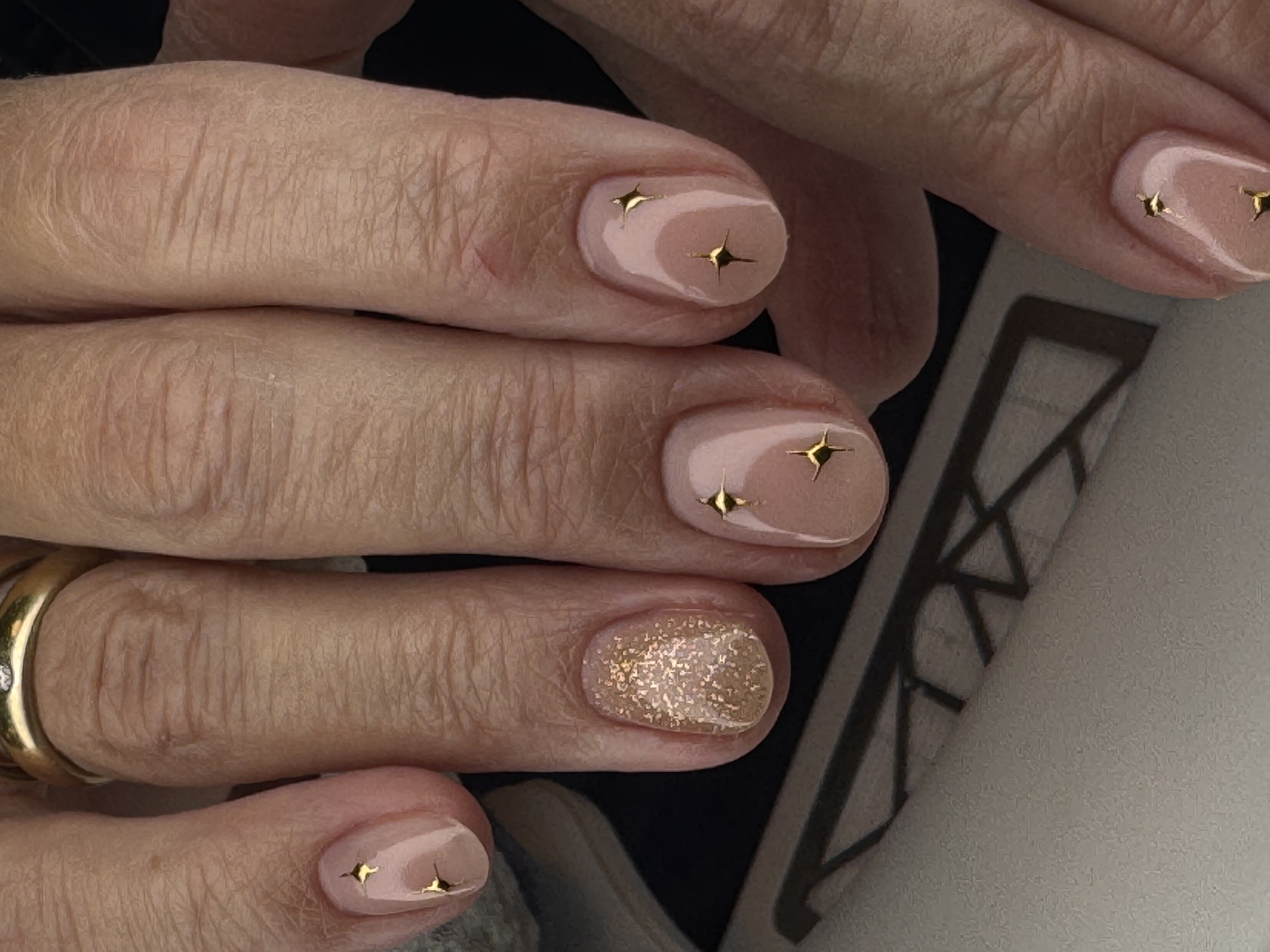 Kort Forstærkning af egne negle med en enkelt glimmernegl, og små stjerner lavet med chrome.